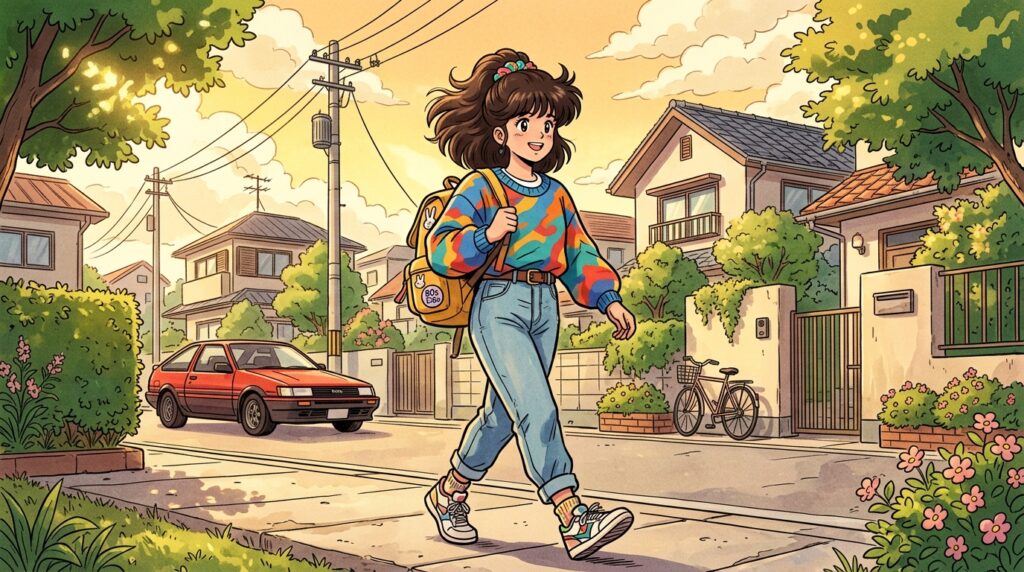 80年代アニメのキャラクターが今見てもおしゃれだと感じられるのは、当時のリアルなファッション・トレンドが作品の中に驚くほど忠実に取り入れられていたからです。それまでのアニメ衣装が、記号的で架空のデザインが多かったのに対し、この時期はキャラクターが普段着として、ハイウエストのジーンズやオーバーサイズのシャツ、サマーセーターなどを着こなす描写が当たり前になりました。